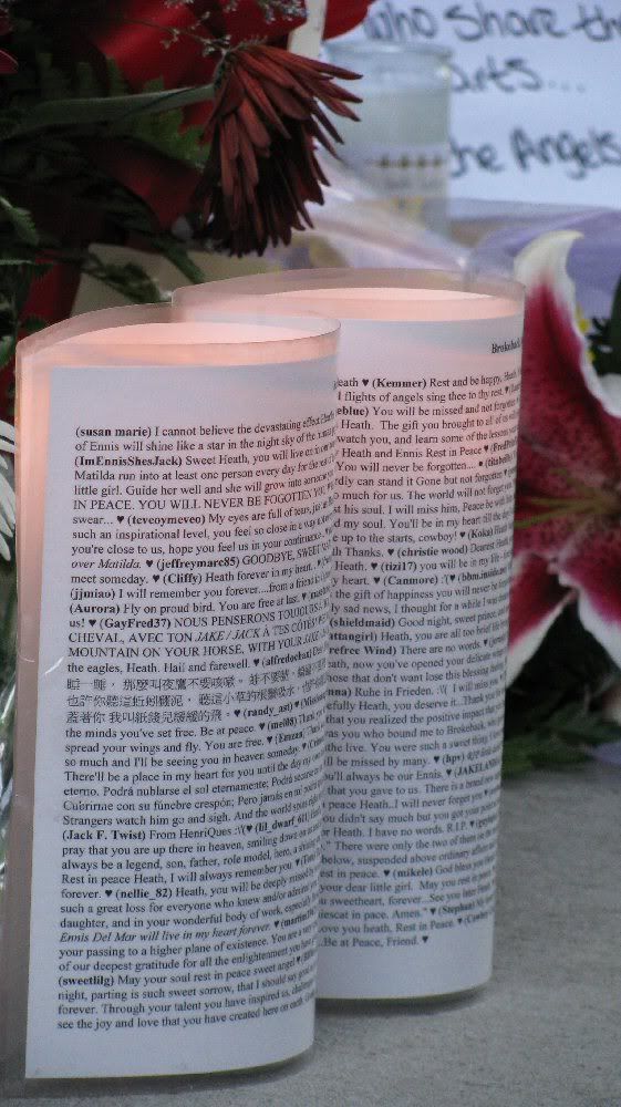 Ethan and Michelle, I thank you from the bottom of my heart for doing that. Seeing all the flowers and the notes and how much Heath was loved is simply overwhelming. I wish I could be there with you, go there with you, but I'm so greatful that you did this on behalf of all of us who couldn't. What you did for him is trully beautiful.
