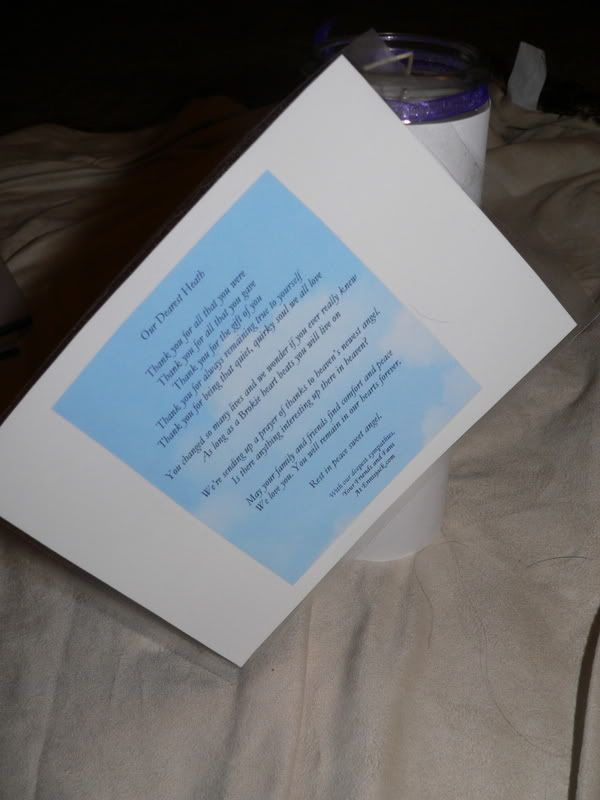 Ethan, this is totally touching. I'm a wreck right now. These pics are so heartwarming; it's so marvellous seeing how much loved our sweet Heath was. That make feel a little bit better. I wish I were there.