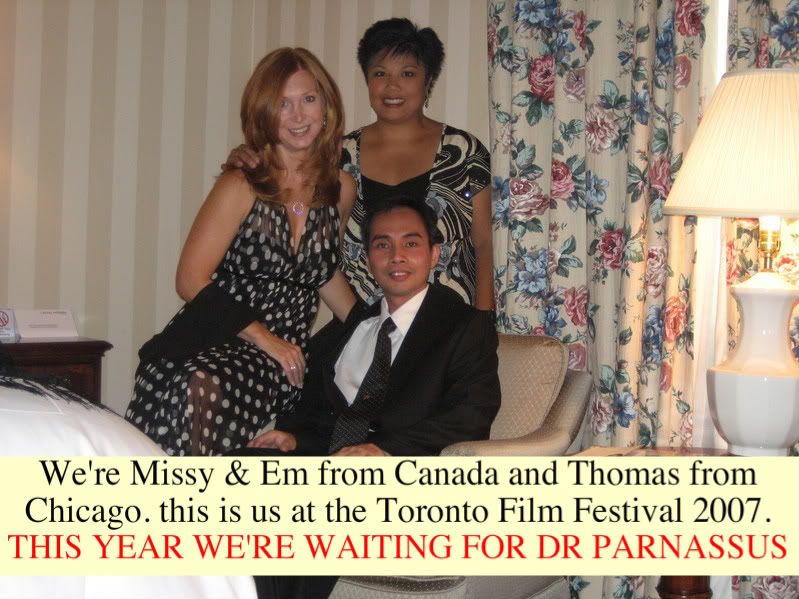 Christie, do you remember when we first heard that Candy was going to Toronto.  Lord, that seems like a lifetime ago doesn't it.  You know I was talking to Luke the other day and he asked me for the Dr. Parnassus web address so he could go to the site (which he loved) and he said I love your passion for these movies, "Keep sticking your neck out, I promise no one will chop it of."